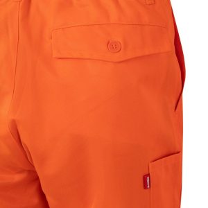 Cuatro bolsillos: 2 bolsillos franceses; 1 bolsillo trasero de vivo con tapeta y botón y 1 bolsillo para herramienta en pierna derecha